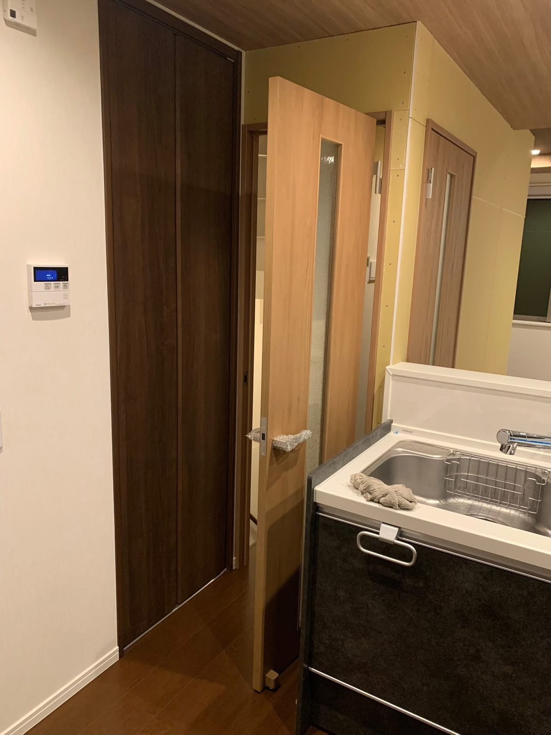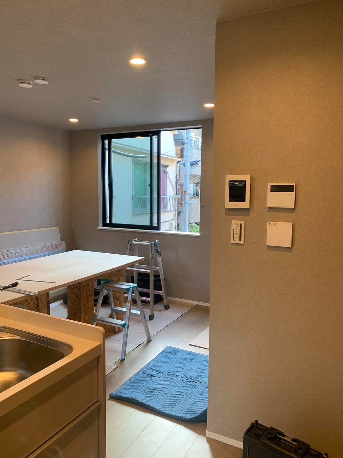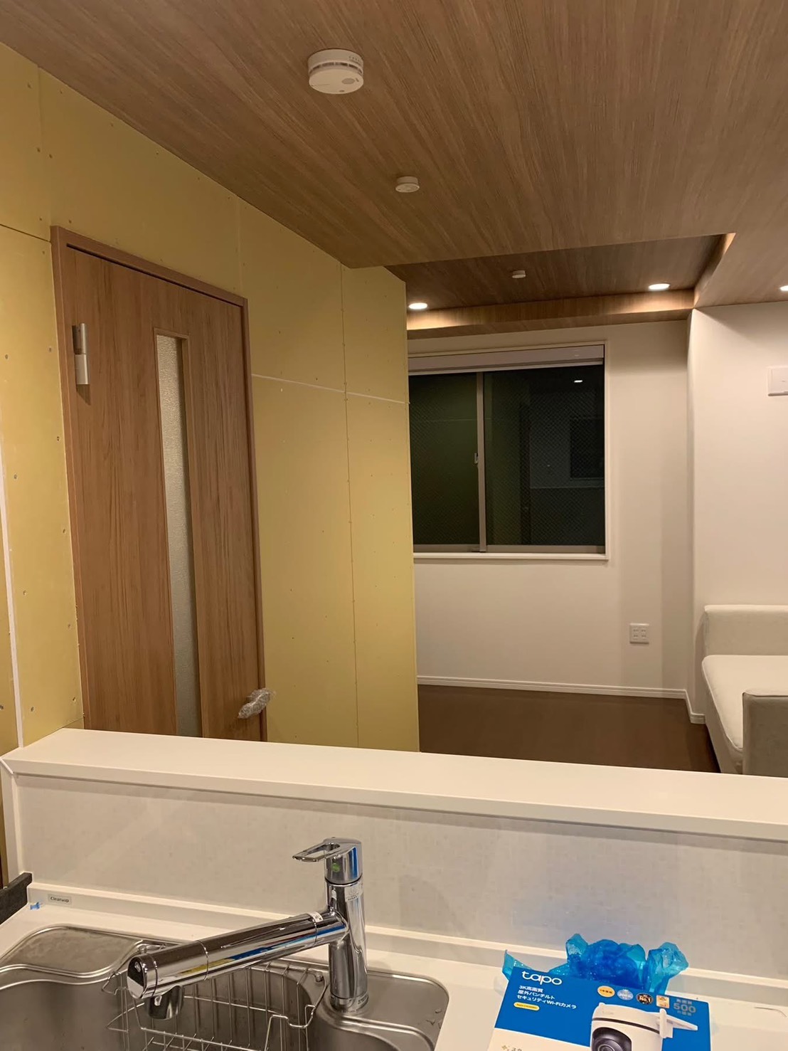 戸建新築住宅を民泊にする為に竪穴区間工事のご依頼。民泊施設にする為の必須工事、間仕切り壁設置・ドア設置。カウンター取付、クロス工事