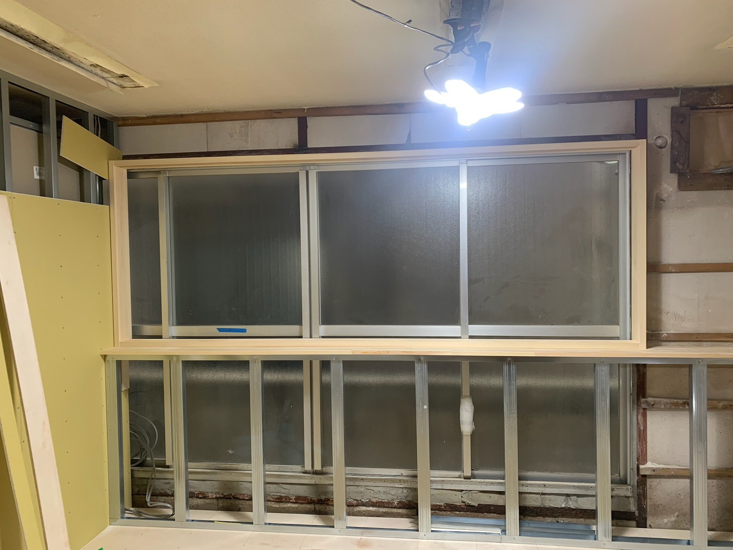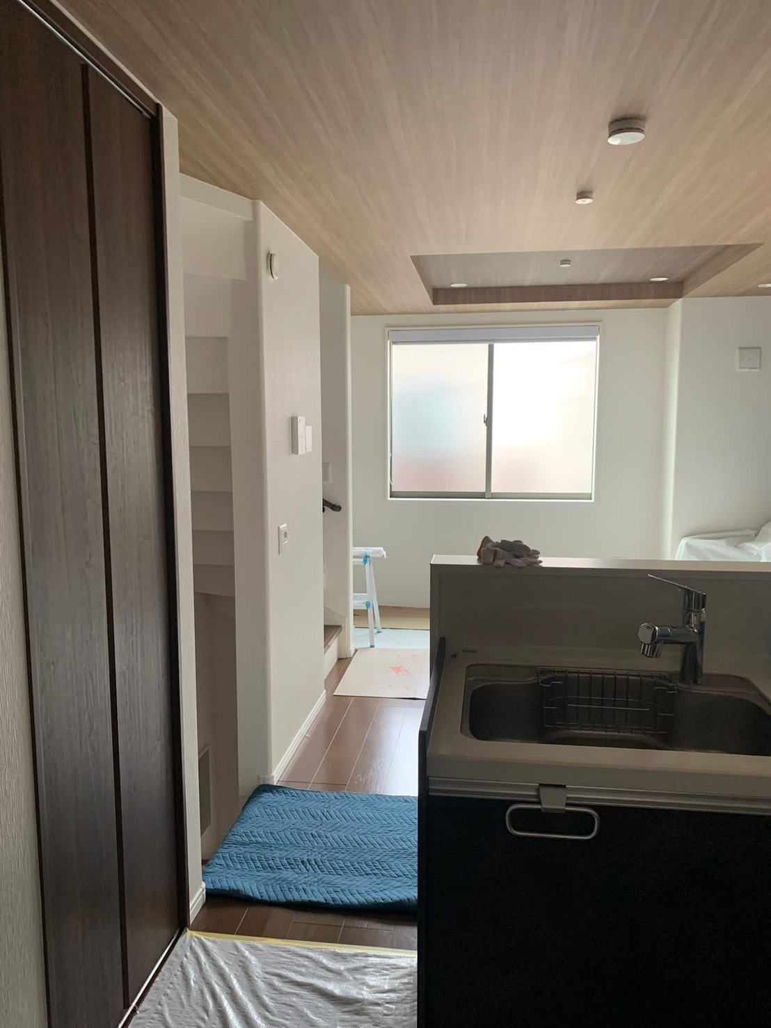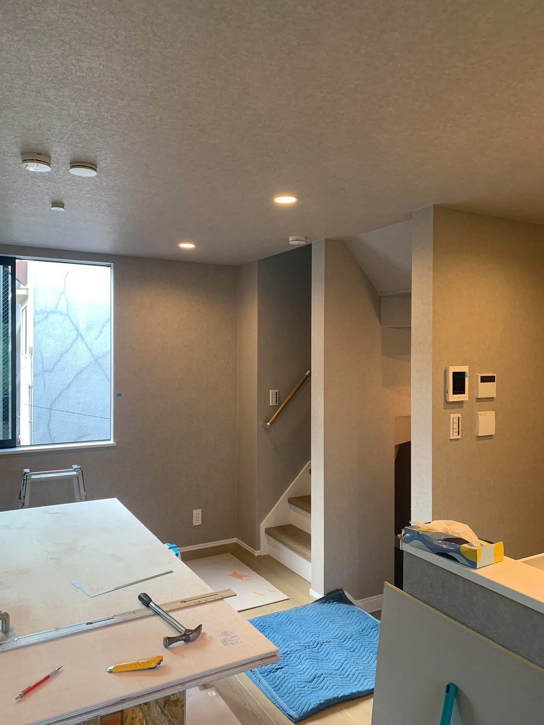 戸建新築住宅を民泊にする為に竪穴区間工事のご依頼。民泊施設にする為の必須工事、間仕切り壁設置・ドア設置。カウンター取付、クロス工事