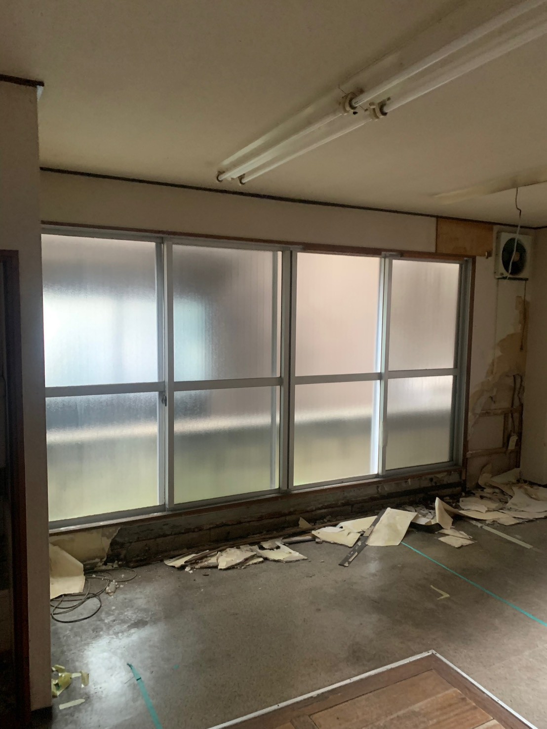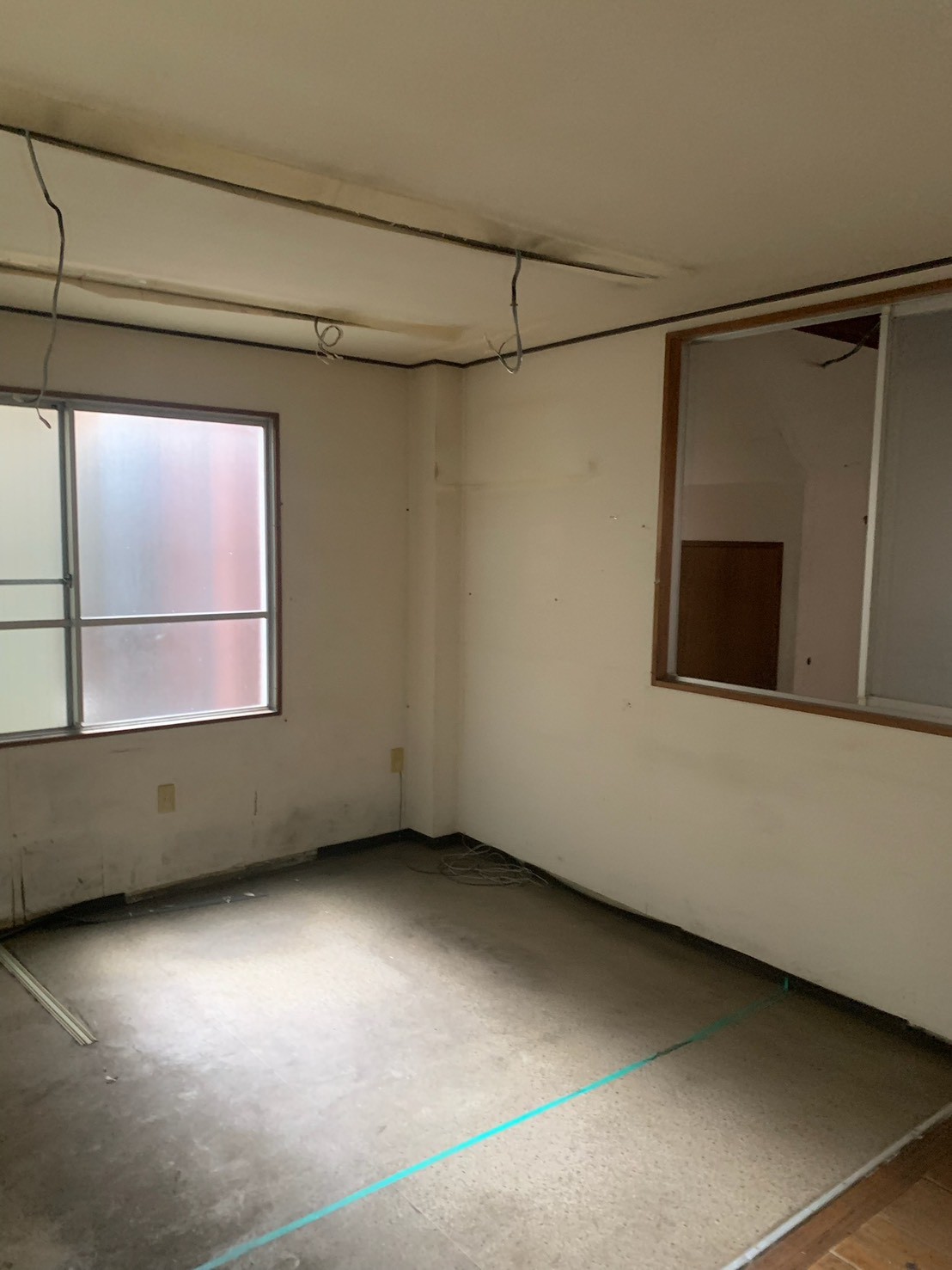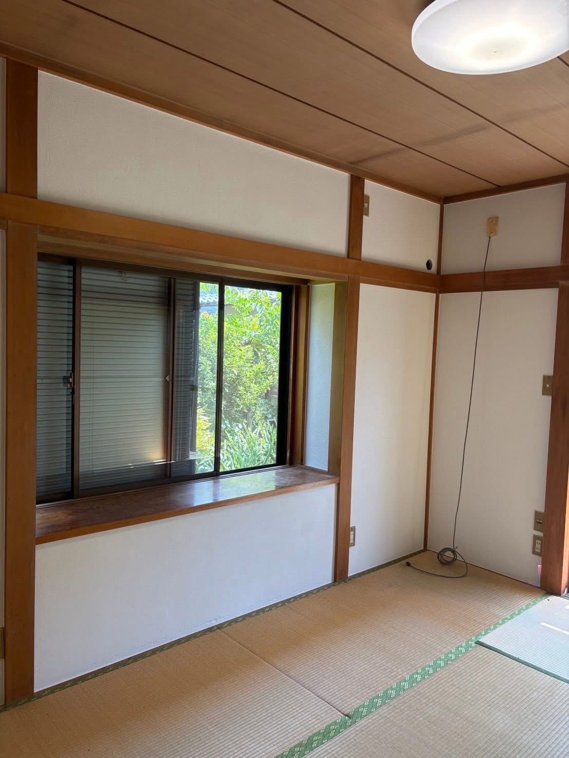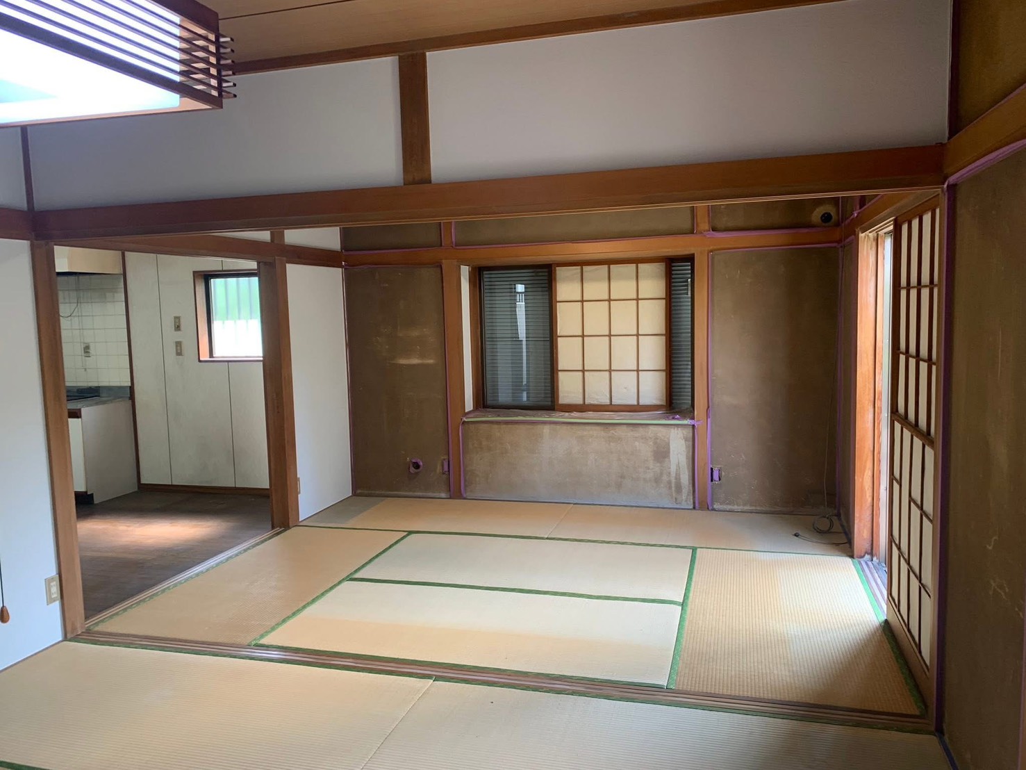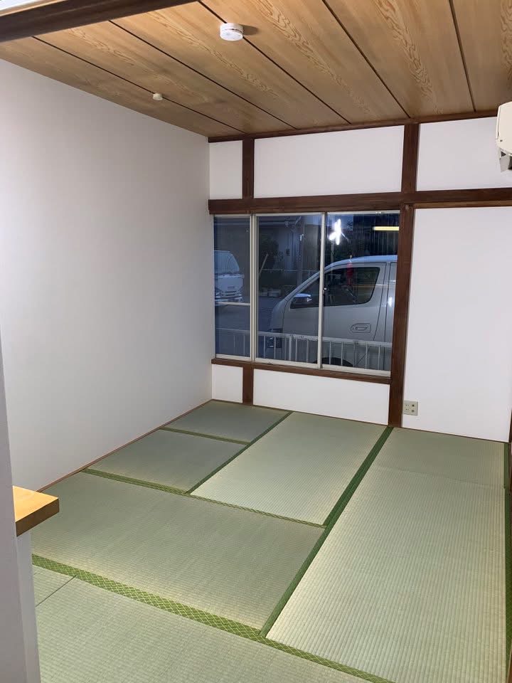 戸建住宅を介護施設にとのご依頼。2棟目。解体工事・庭木手入れ・防水工事(駐車場)・電気工事・畳表替え・クロス貼り替え・ドア制作・間仕切り壁設置