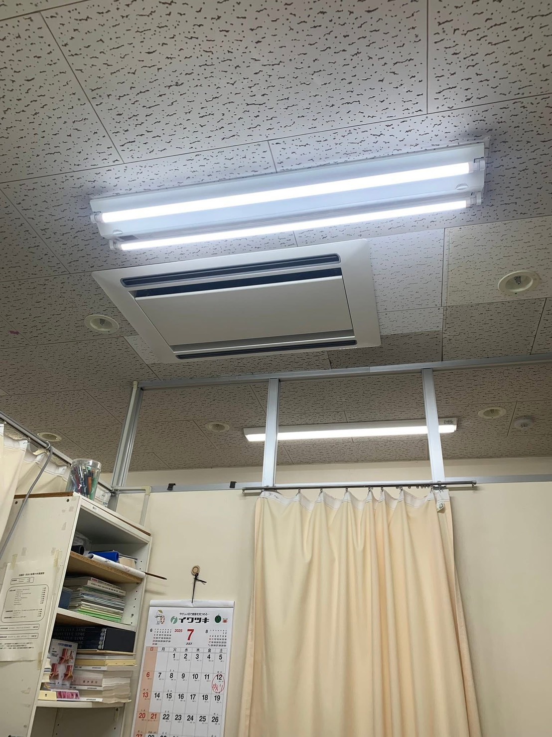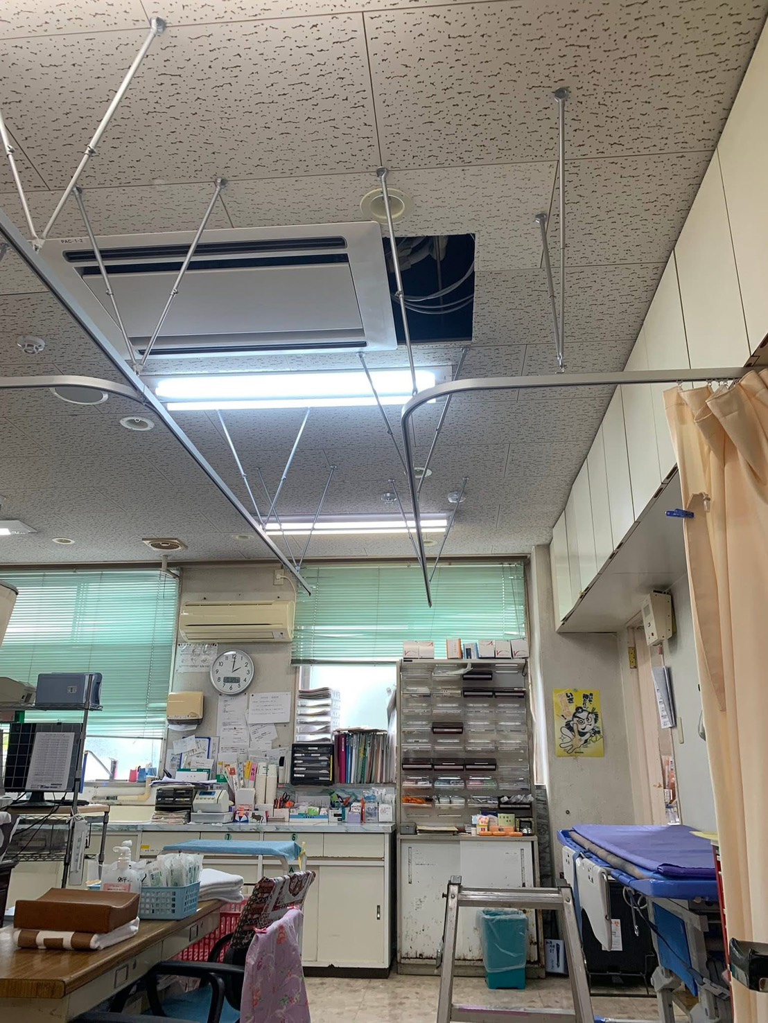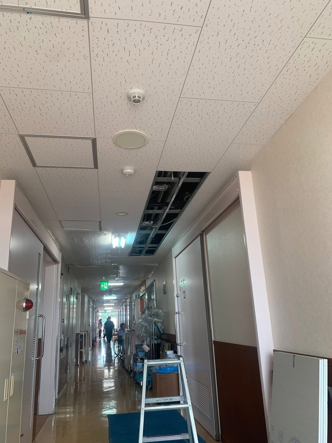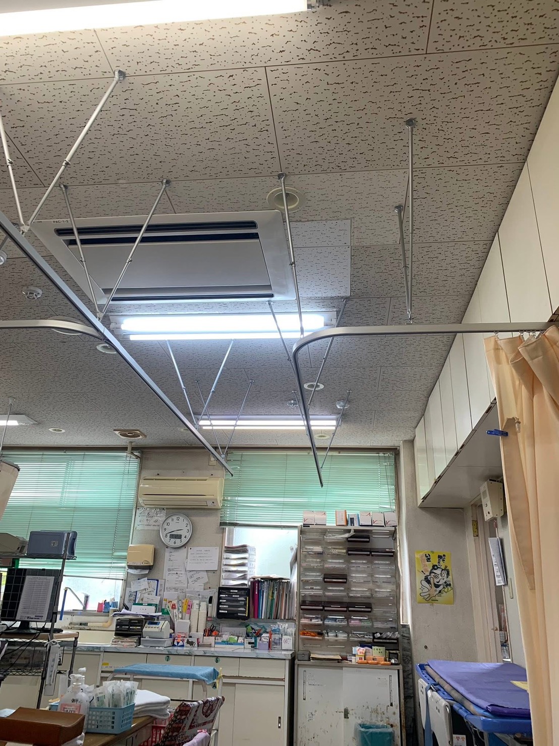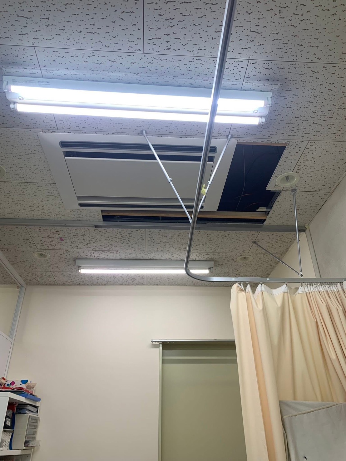 天井埋込エアコン工事を先行したために、既存のエアコンより小さくなり天井が全て覆われていないと消防検査通らないので天井を貼ってほしいとのご依頼。