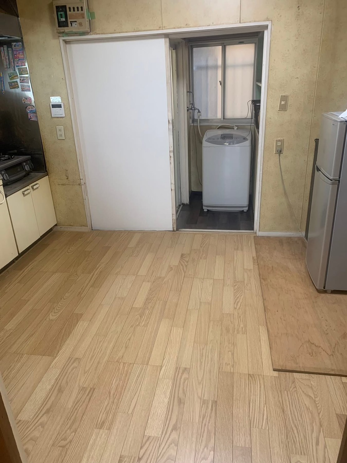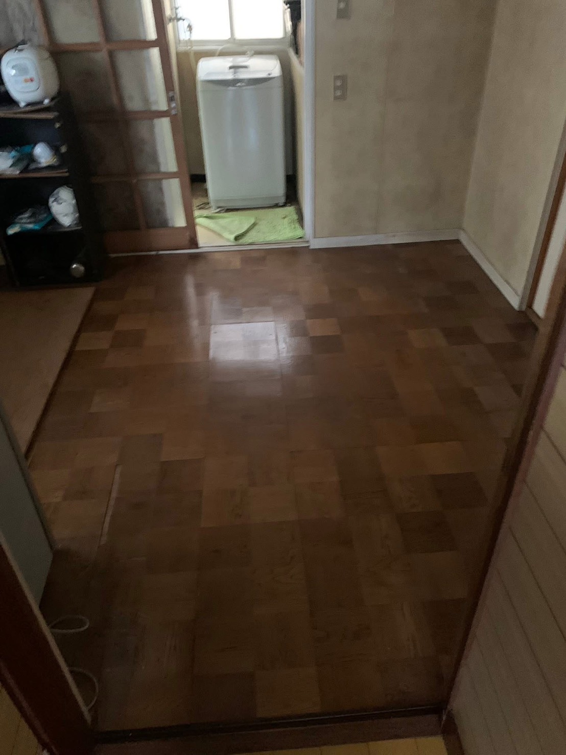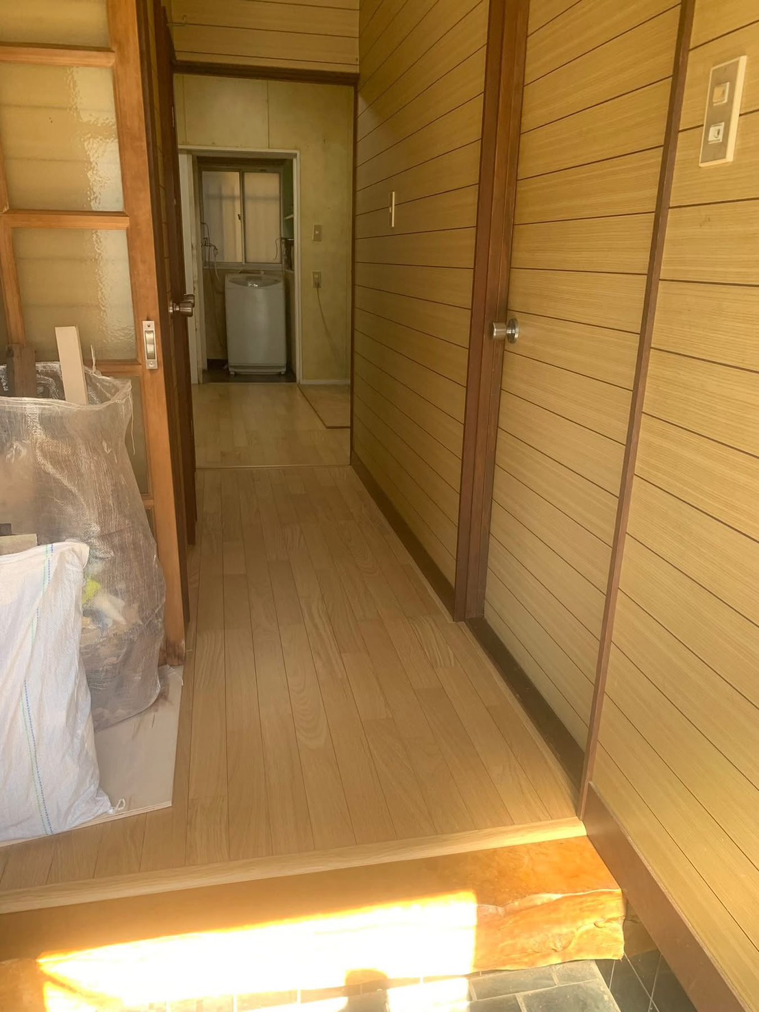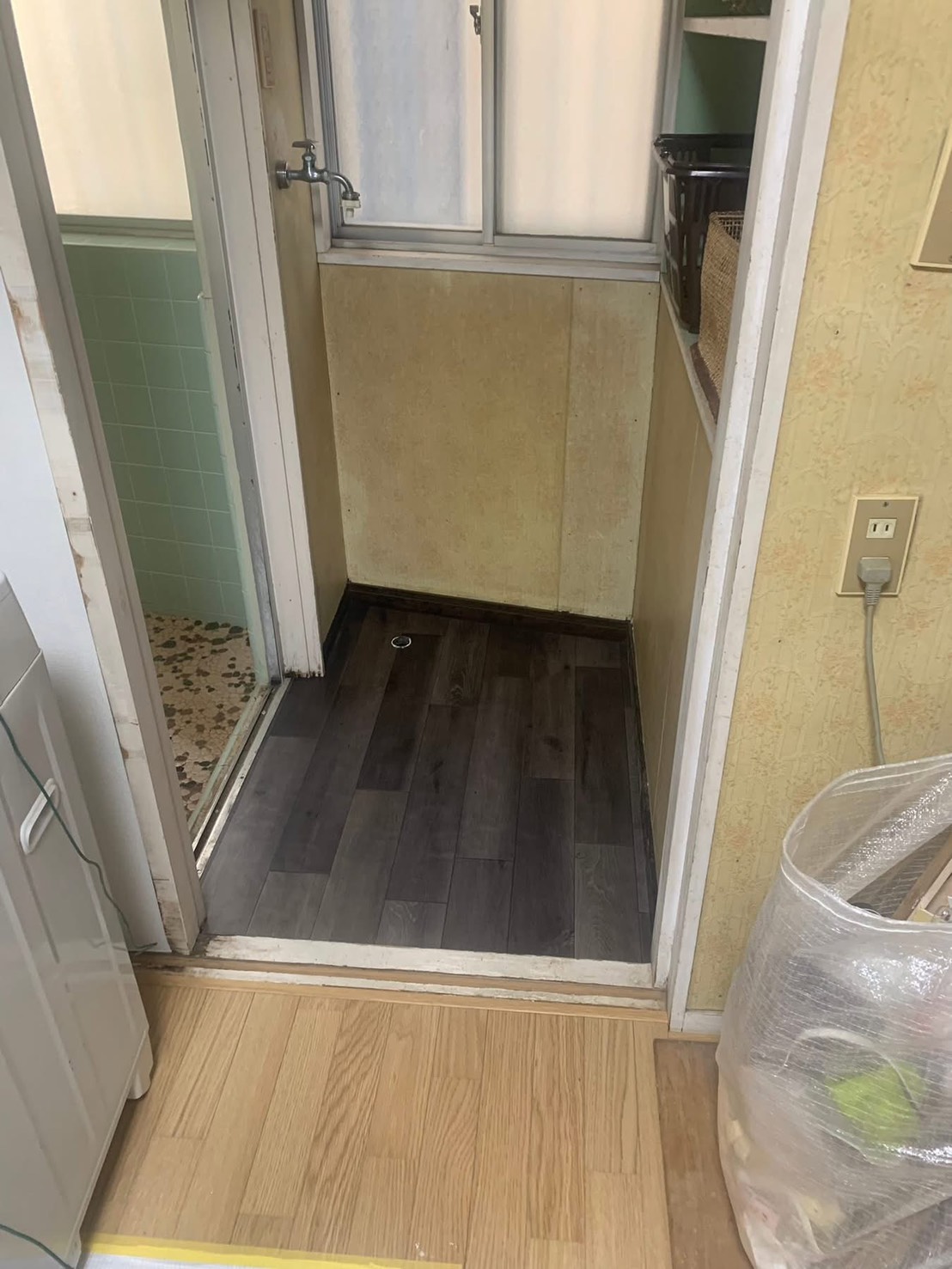 会社の寮のリフォームのご依頼。玄関・廊下・キッチン・洗面の床がブカブカのため、どうにかして欲しいとのご依頼。 玄関・廊下・キッチンは解体費・処分費をなくす為に既存の床の上にフローリングを増し貼り。洗面は腐っていたので解体して新たに床を仕上げました。