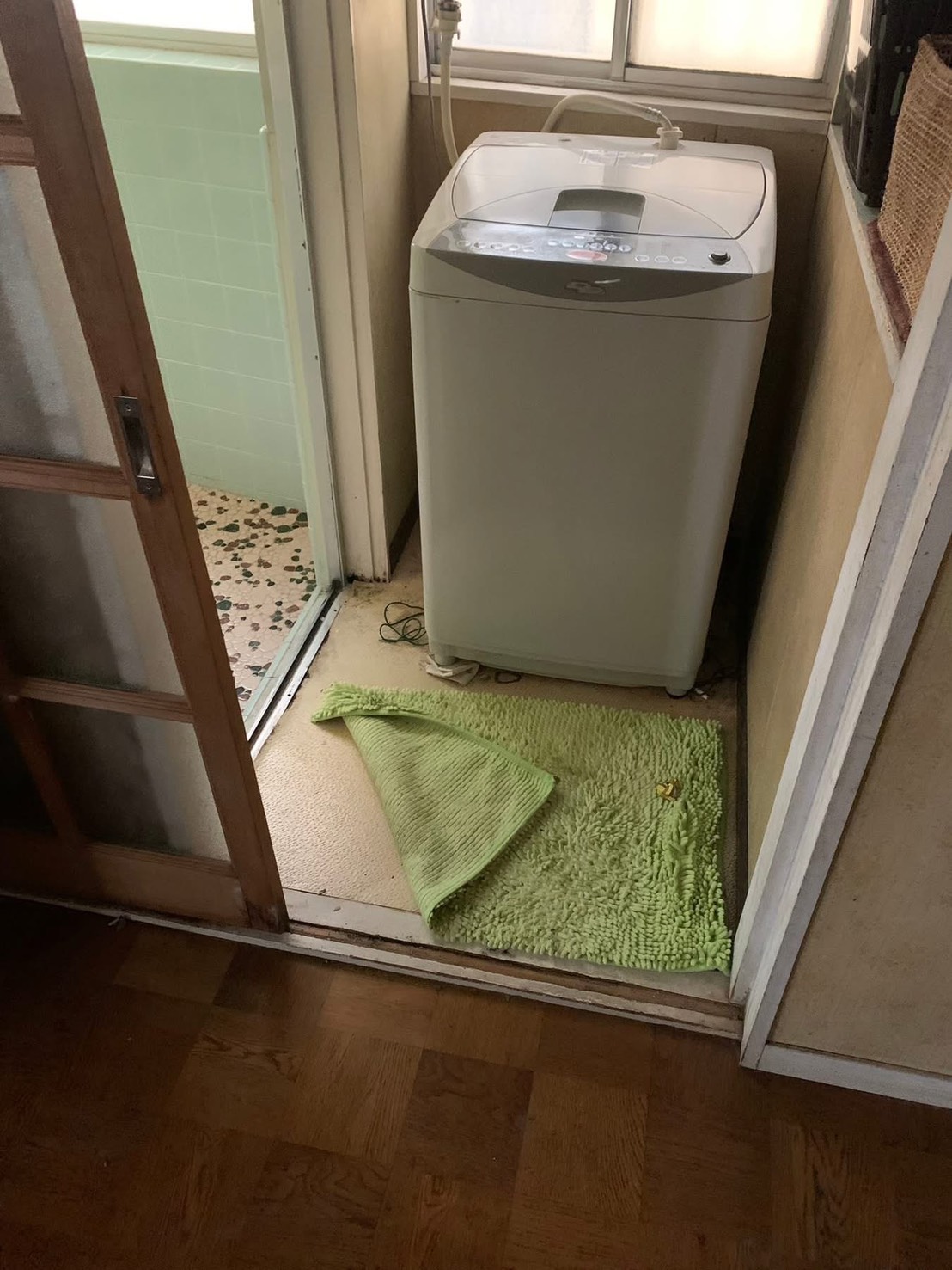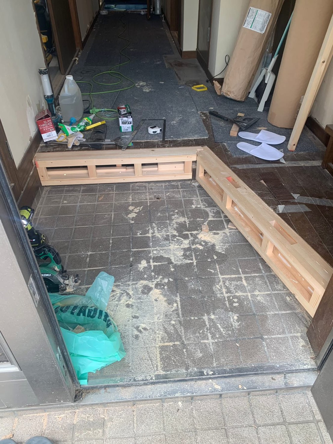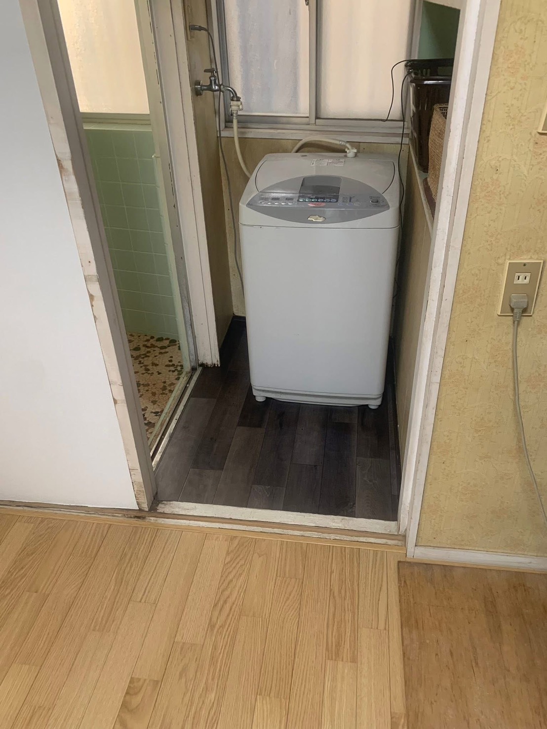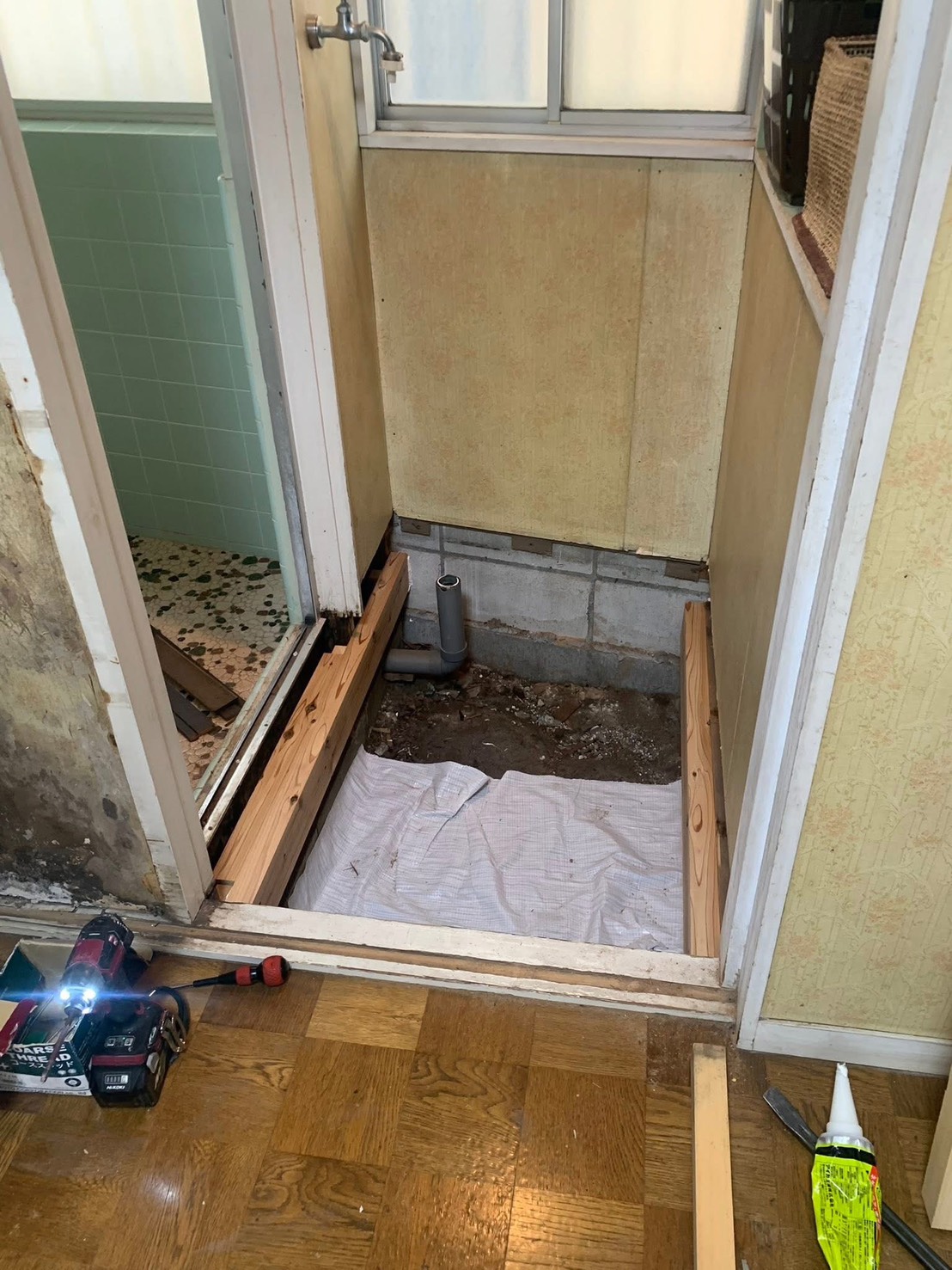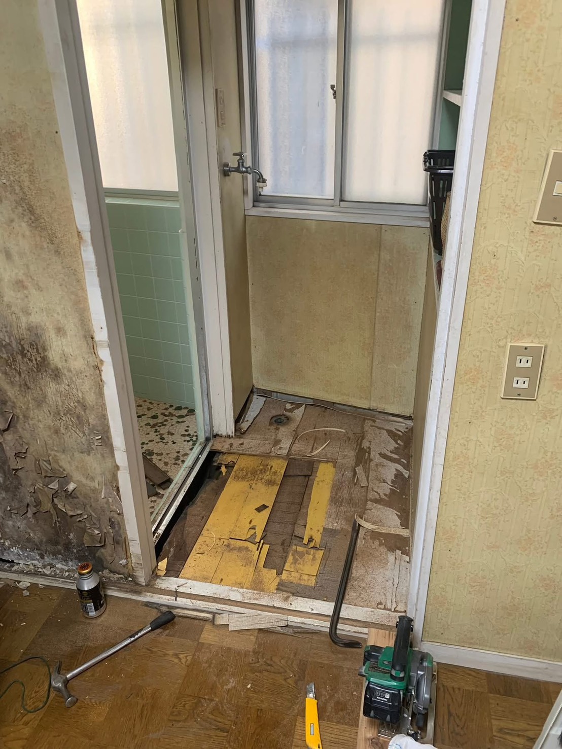 会社の寮のリフォームのご依頼。玄関・廊下・キッチン・洗面の床がブカブカのため、どうにかして欲しいとのご依頼。 玄関・廊下・キッチンは解体費・処分費をなくす為に既存の床の上にフローリングを増し貼り。洗面は腐っていたので解体して新たに床を仕上げました。