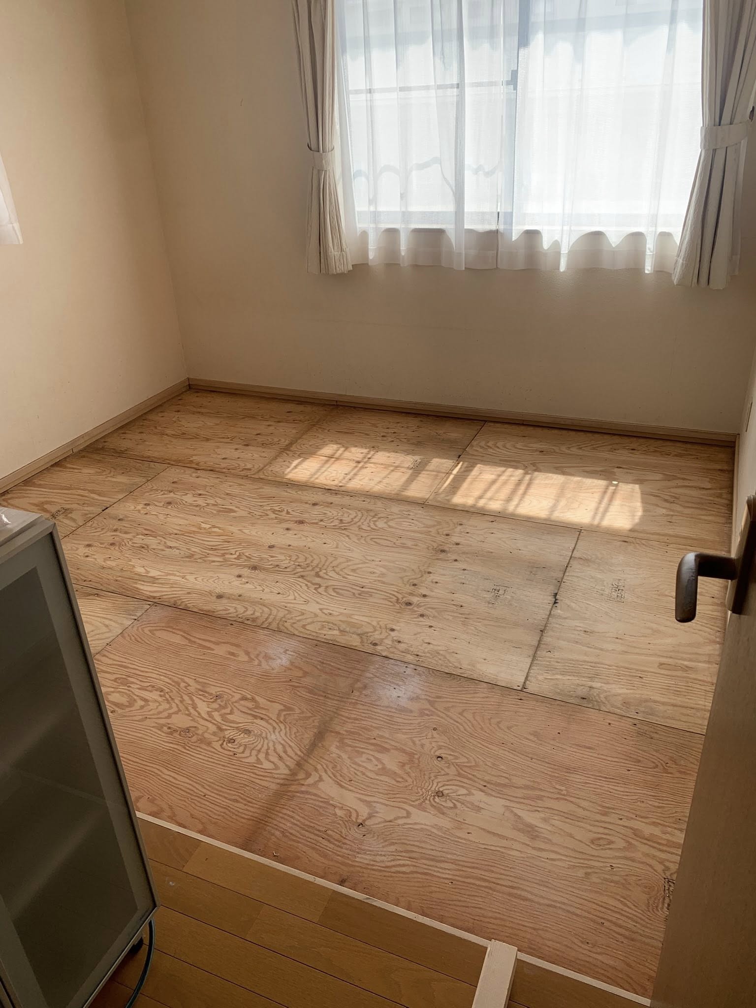 事前の情報では和室は4.5畳とのこと。私たちも、その情報に基づいて4.5畳分のフローリング材を準備し、いざ現場へ。